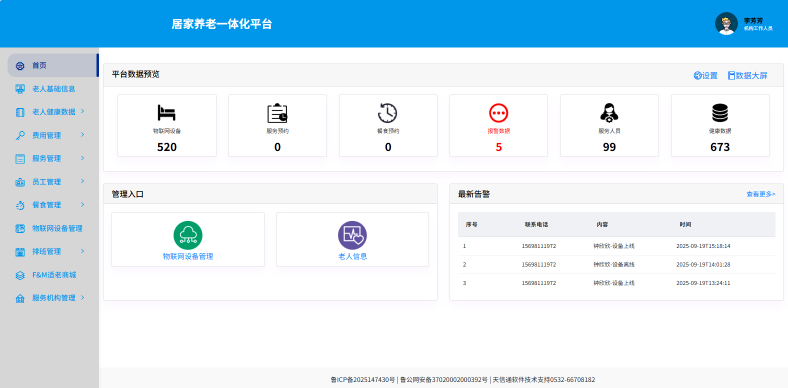 通过智能后台管理系统,对社区老人、服务人员、智慧设备进行管理,实现了智慧监测、服务预约、订餐送餐、社交娱乐等功能,满足老人居家养老的需求。