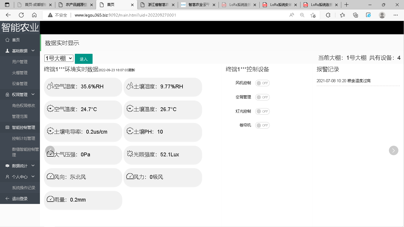 实时显示环境中的温度、相对湿度、光照强度、土壤湿度、CO2浓度等物理量参数,所有数据一目了然,便于及时清楚了解大棚内的种植情况。
