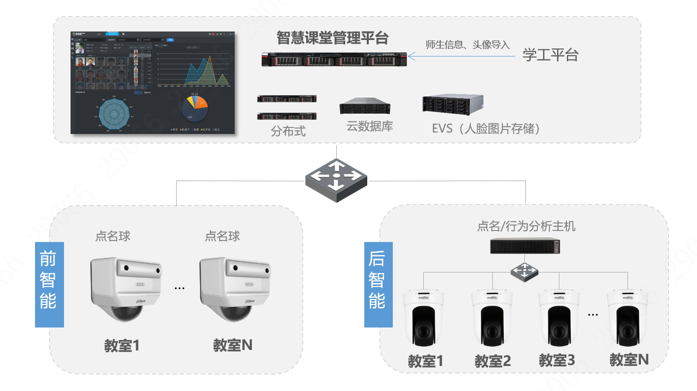 后智能方式在教室部署普通球机,并加载后端人脸识别服务器,实时分析前端摄像机的视频流,识别人脸结果、人脸照片实时上传至管理平台。